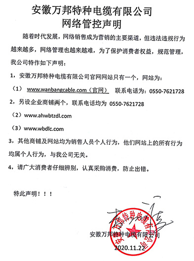 鄭重聲明:安徽萬邦特種電纜有限公司官方網站為:www_wanbangcable_com.chinachaoshi.com,除此之外無任何子網站或合作網站,其余均為假冒偽劣。電話:0550-7621728 13485756353 地 址:安徽省天長市滁州高新技術產業開發區經四路29號